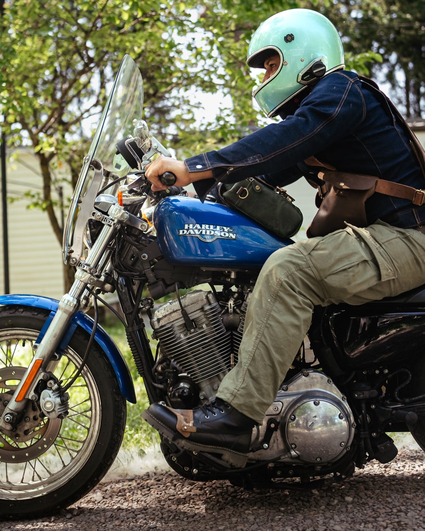 Person wearing brown boots on a motorcycle with a blurred background
