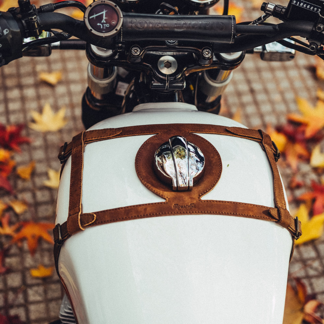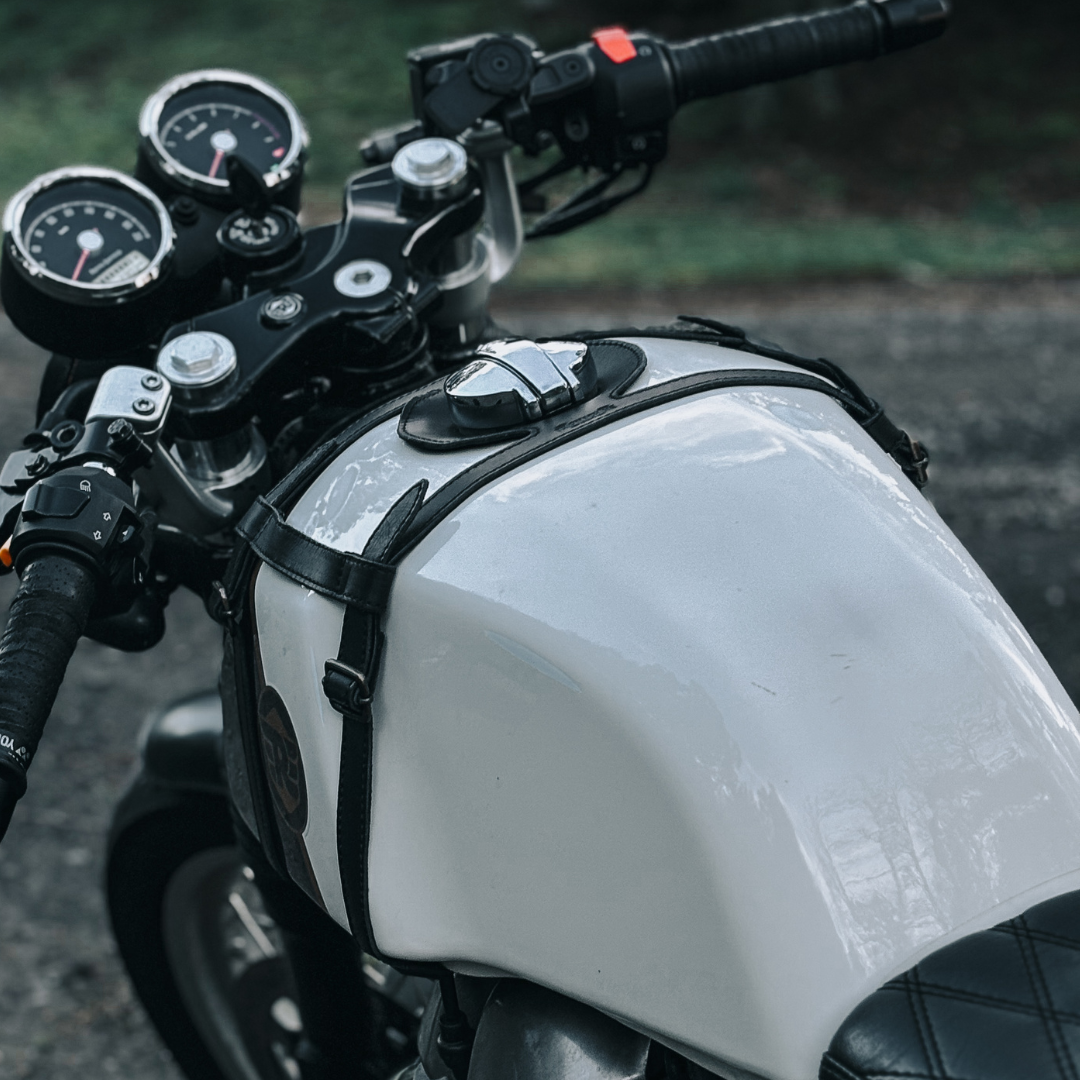 presenting the superhero of tank straps, ready to swoop in and add a dash of flair to your bike! This isn't your average strap; it's a tank-hugging, shape-maintaining, and fuel cap-friendly wonder that's here to make your motorcycle look as cool as you feel.