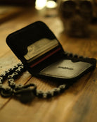 we built it using an actual chain that has been powder coated for longevity. the wallet is slim to feel better while riding and has been crafted using our signature water resistant suede to stand out in the crowd.
