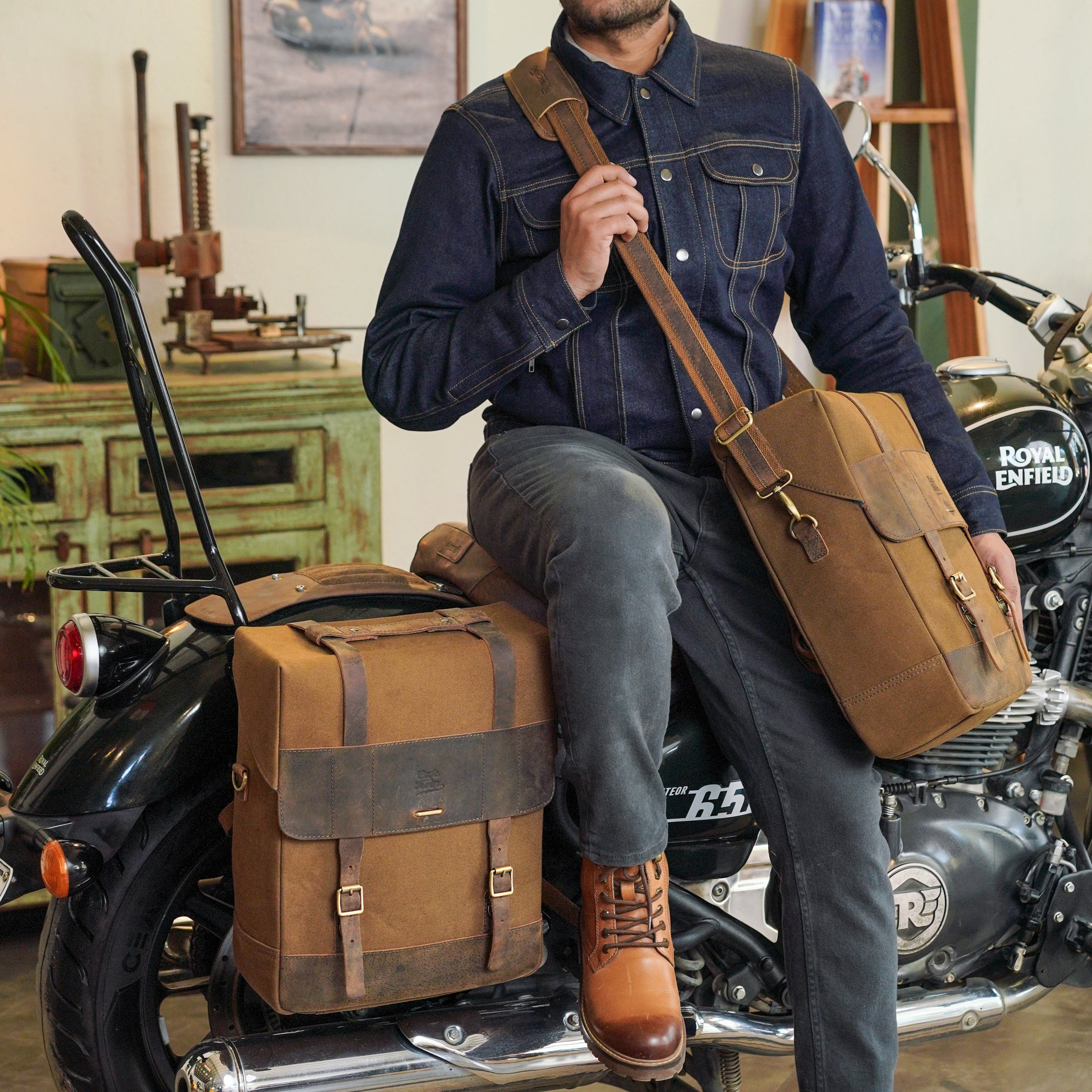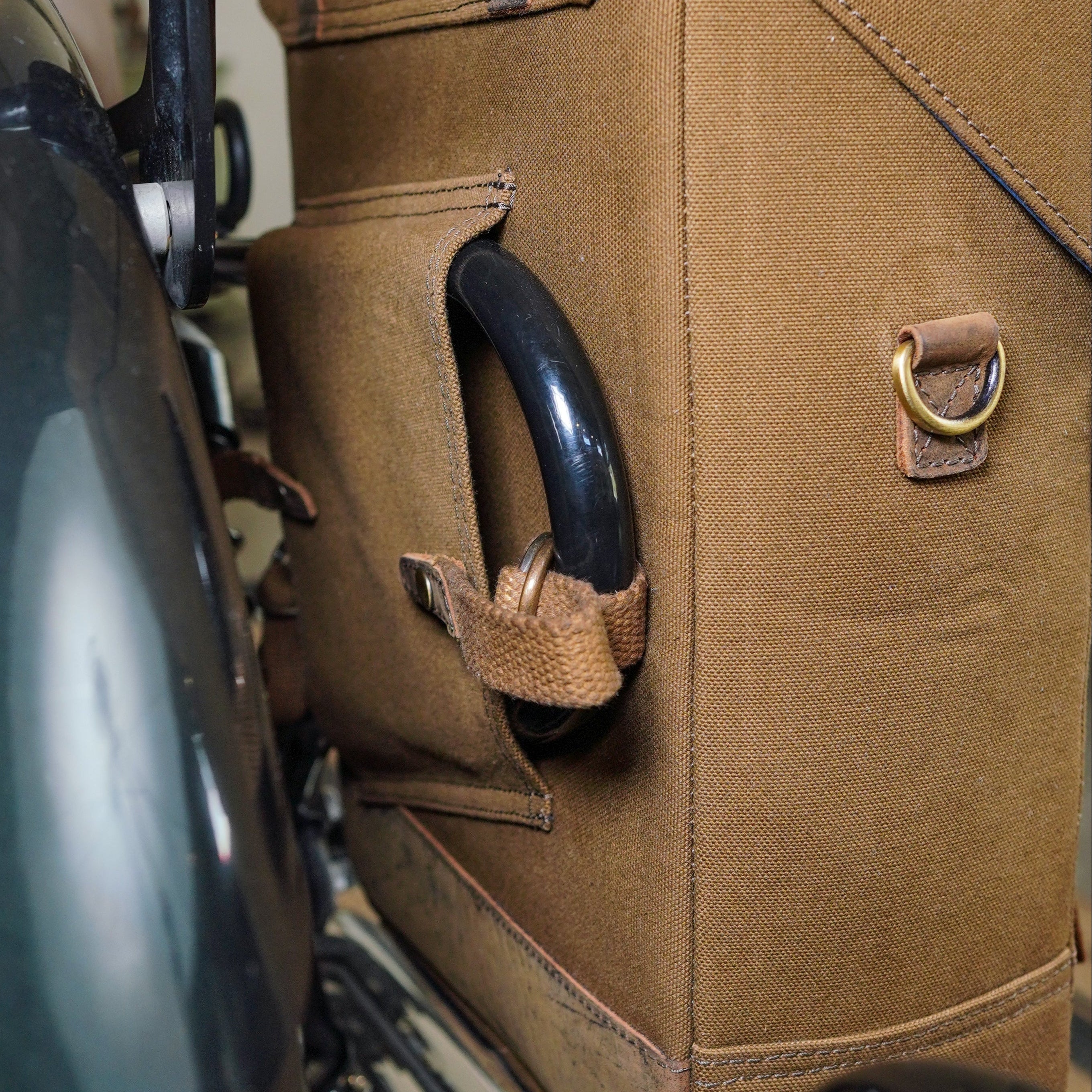 the ventura is our take on the perfect saddlebag. inspired from the saddlebags used in world war ii, these bags have been crafted from 16 oz heavy duty canvas and our signature trip machine leather.