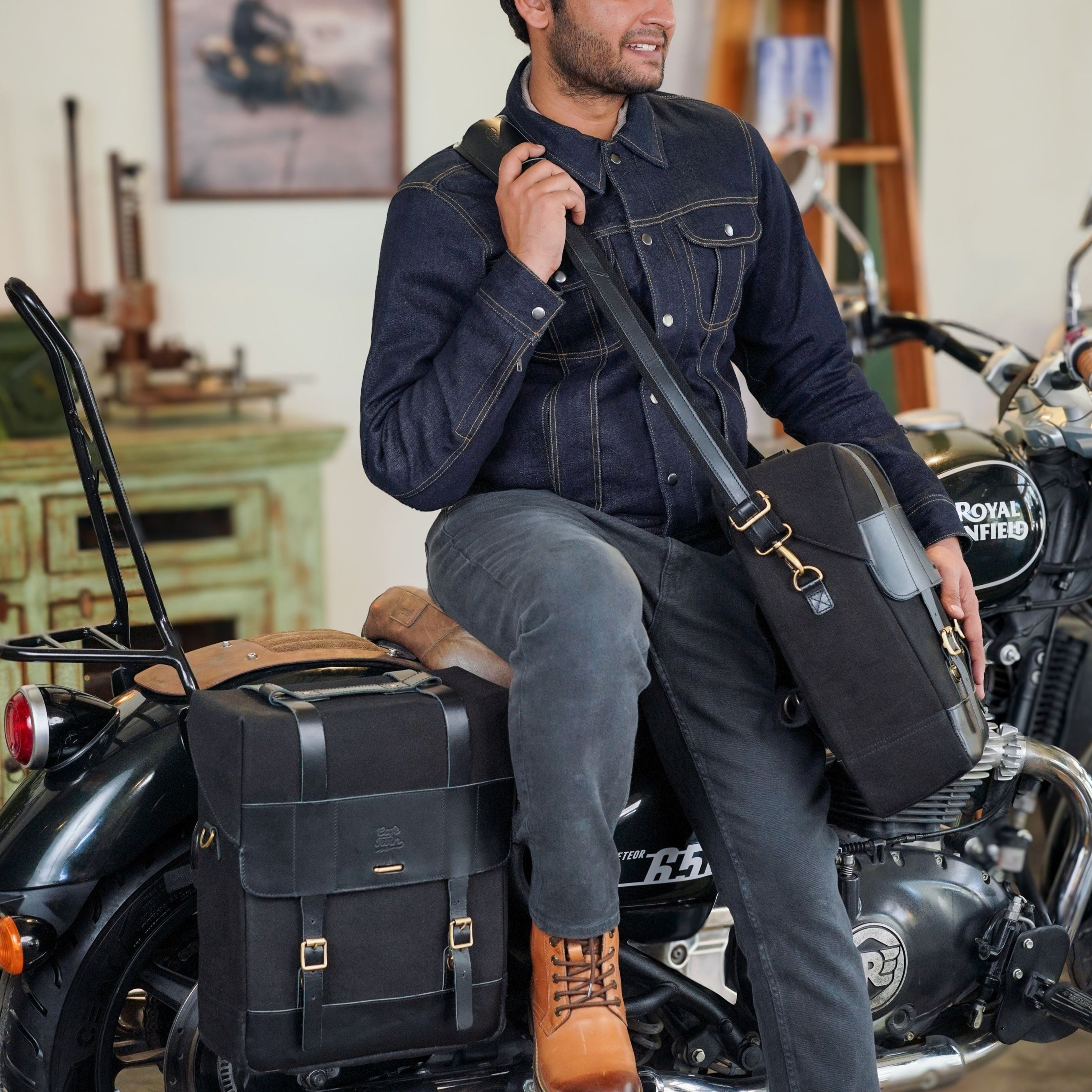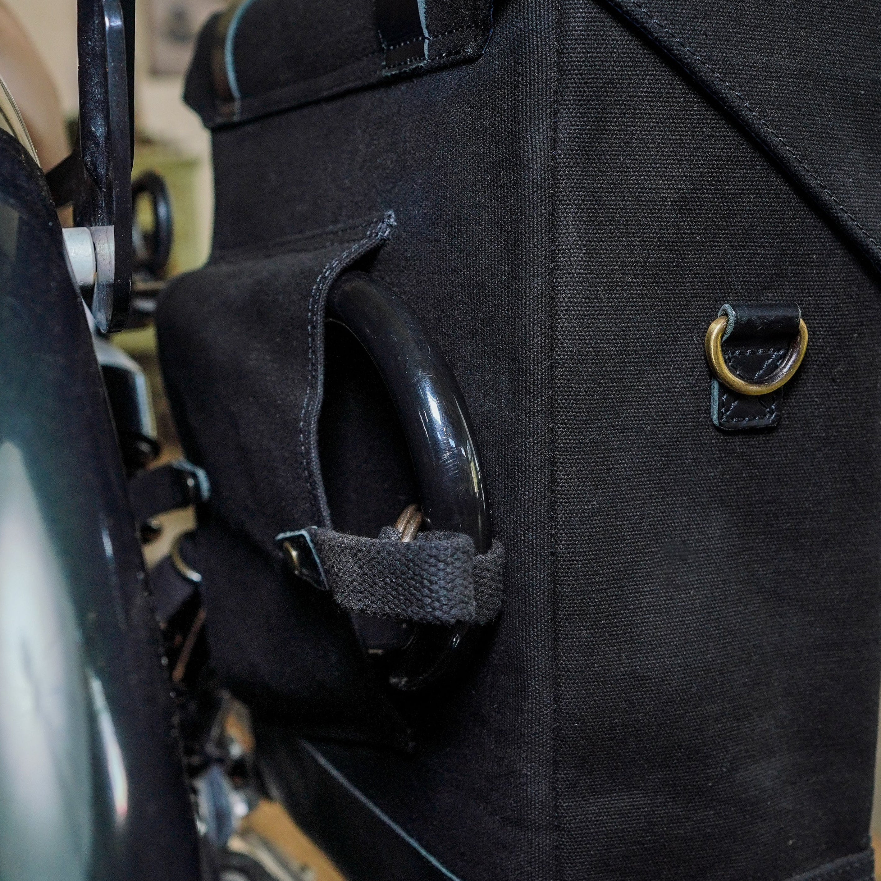 the ventura is our take on the perfect saddlebag. inspired from the saddlebags used in world war ii, these bags have been crafted from 16 oz heavy duty canvas and our signature trip machine leather.